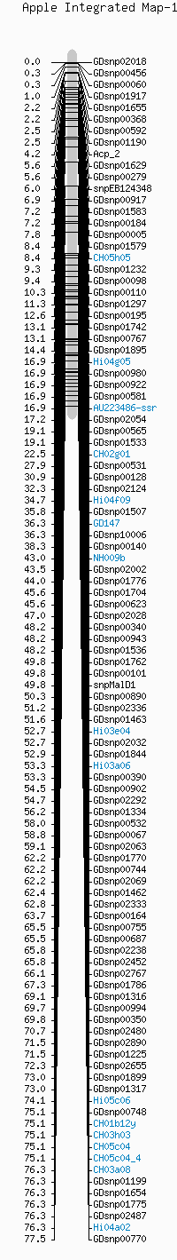 | Reference publication | Silfverberg-Dilworth E, Matasci C L, Van de Weg W E, Van Kaauwen M P W,Walser M, Kodde L P, Soglio V, Gianfranceschi L, Durel C E, Costa F, Yamamoto T, Koller B, Gessler C, Patocchi A (2006) Microsatellite markers spanning the apple (Malus x domestica Borkh) genome. Tree Genetics & Genomes 2(4): 202-224 | ||||