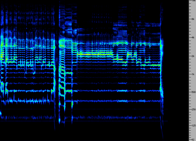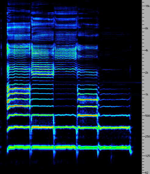 20) in grado di produrre suoni impossibili ad un occidentale se non attraverso sofisticate apparecchiature elettroniche. Lo sciamano di Tuva intona una nota sola, e all’interno dello spettro di questa trova tutto il materiale necessario al suo canto. In pratica è in grado di “suonare” le parziali dello spettro della sua voce come se fossero le corde di un’arpa.Rispetto alle grossolane modulazioni che noi “occidentali” siamo in grado di compiere quando passiamo da una vocale all’altra è chiarissimo che lo spettro del canto xöömej è molto più composto e controllato (fig. 2 e 3). In questo caso, nonostante la musica sia di fatto un’esplorazione di una nota sola, il risultato è in qualche misura comprensibile all’occidentale, in quanto gli armonici intonati dal cantore sono utilizzati in funzione melodica. Il riconoscere una melodia ci permette di accettare questi suoni come musica senza eccessivi problemi (piuttosto non riusciamo a capire che tali suoni sono prodotti da un essere umano, e l’incertezza della sorgente impone all’ascoltatore un “ascolto ridotto” coatto).